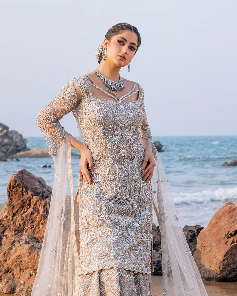 Additional Description: 1- Introducing our masterpiece, net embroidered cutwork shirt, meticulously adorned with intricate handcrafted adda work. This opulent creation showcases a harmonious blend of naqshi, dabka, and Swarovski pearls, The shirt has an exaggerated embroidered sleeves cutline and while the back is adorned with a lavish display of heavy adda work. Every stitch tells a story of skilled craftsmanship 2- Complementing the shirt is a mermaid lehnga, also crafted with the utmost attention to detail. The net fabric is embellished with heavy handcrafted adda work on the back and sides, adding to its allure. 3- To complete this ensemble, a separate inner made of shabnam fabric is included.