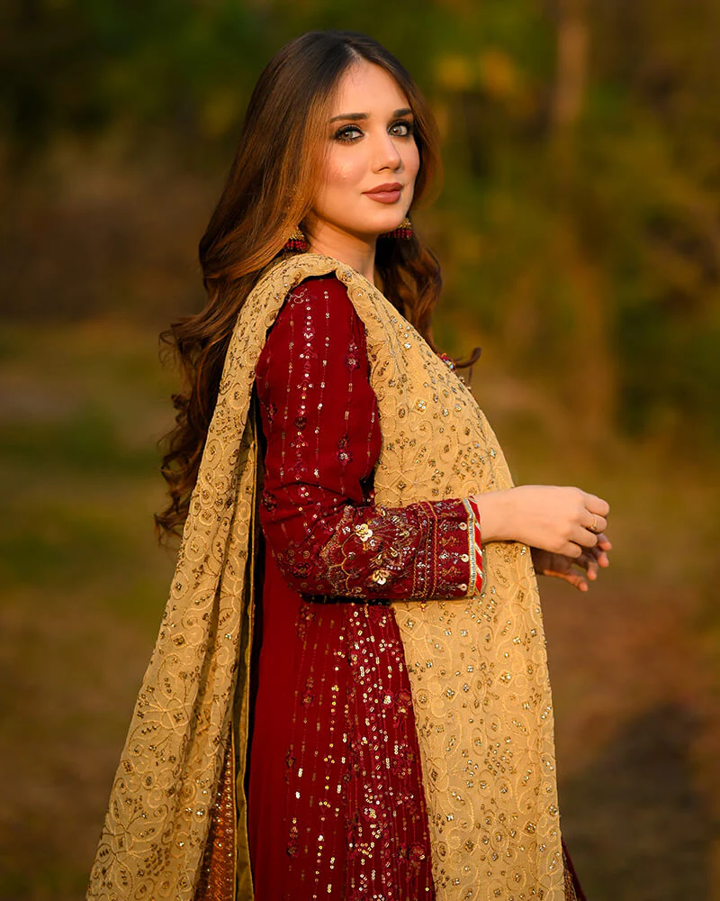Additional Description: 1. Chiffon embroidered maxi enhanced with hand crafted adda work. 2. Viscose embroidered dupatta 3. Grip crushed shararah