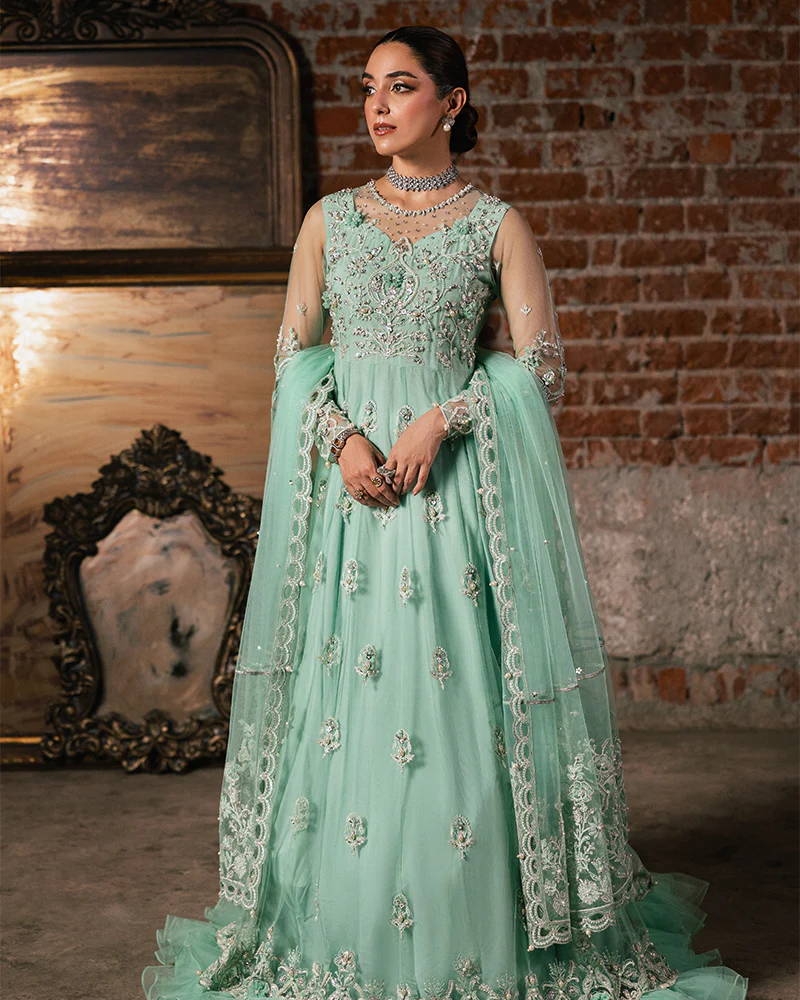 Net maxi is meticulously crafted with the finest hand-embroidered adda work, featuring intricate naqshi designs, delicate pearls, and shimmering sequin embroidery. The stunning 3D floral accents and elegant bottom frills complemented by a luxurious viscose inner lining for comfort