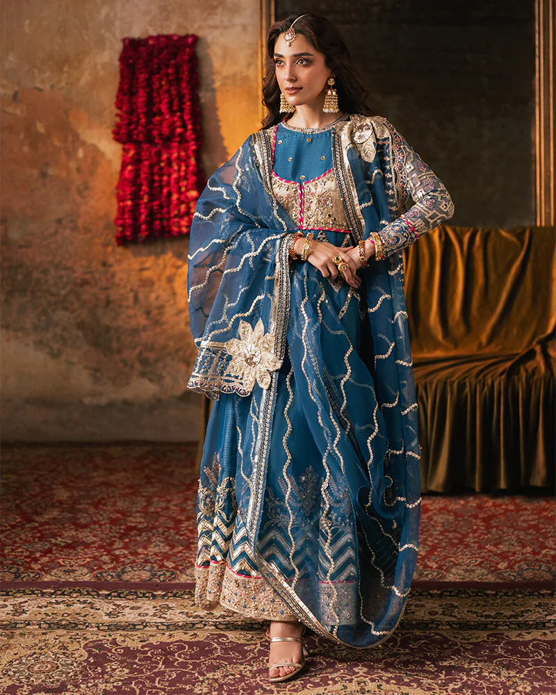 Organza maxi, meticulously crafted with the finest hand-embroidered adda work, showcasing intricate mirror work, elegant naqshi, and stunning dabka work. Adorned with lustrous pearls, gotta patti laces, and delicate sequin tilla embroidery, paranda tussles and a luxurious jamawar inner lining