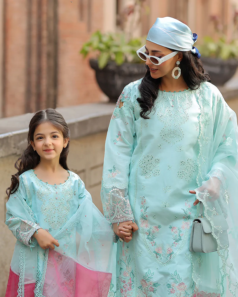 | Cotton chikankari shirt adorned with hand embellished neckline and highlighted with pealrs . Organza two colored dupatta highlighted with laces Cotton trouser |