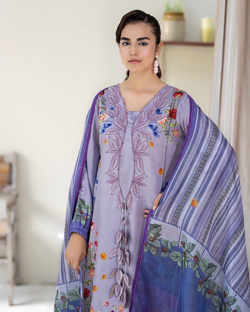Additional Description: 1-Behold the exquisite beauty of this shamose silk printed embroidered shirt, adorned with delicate pearls and intricate 3D floral embellishments 2-The accompanying tissue silk printed dupatta, featuring elegant laces that add a touch of sophistication 3- And let us not forget the grip silk trousers