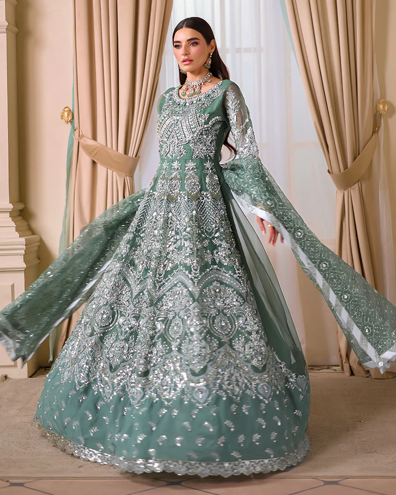 Organza maxi dress is meticulously crafted with sequin embroidery, pearls, naqshi crystals, and seashells, creating a stunning 3D embellishment effect