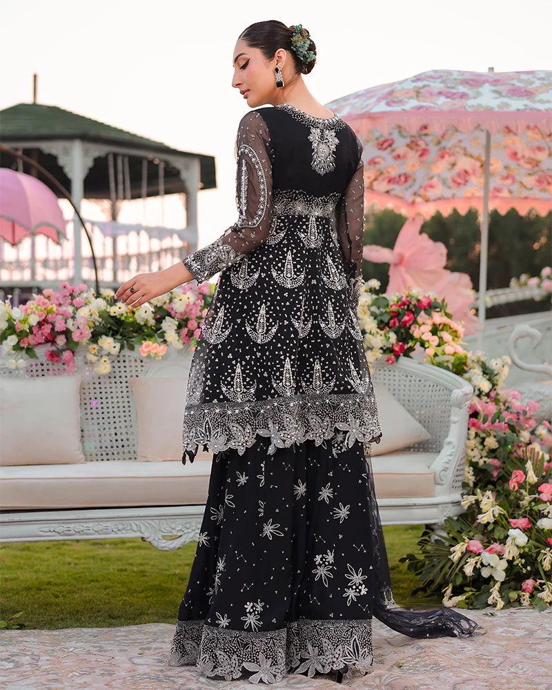 | Stunning organza peplum that's been expertly crafted with embroidery, pearls, crystals, chain work, naqshi, and cutwork borders. Net dupatta is adorned with pearls for an extra touch of elegance Viscose panel shararah, which features intricate embroidery and cutwork borders |